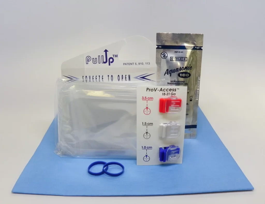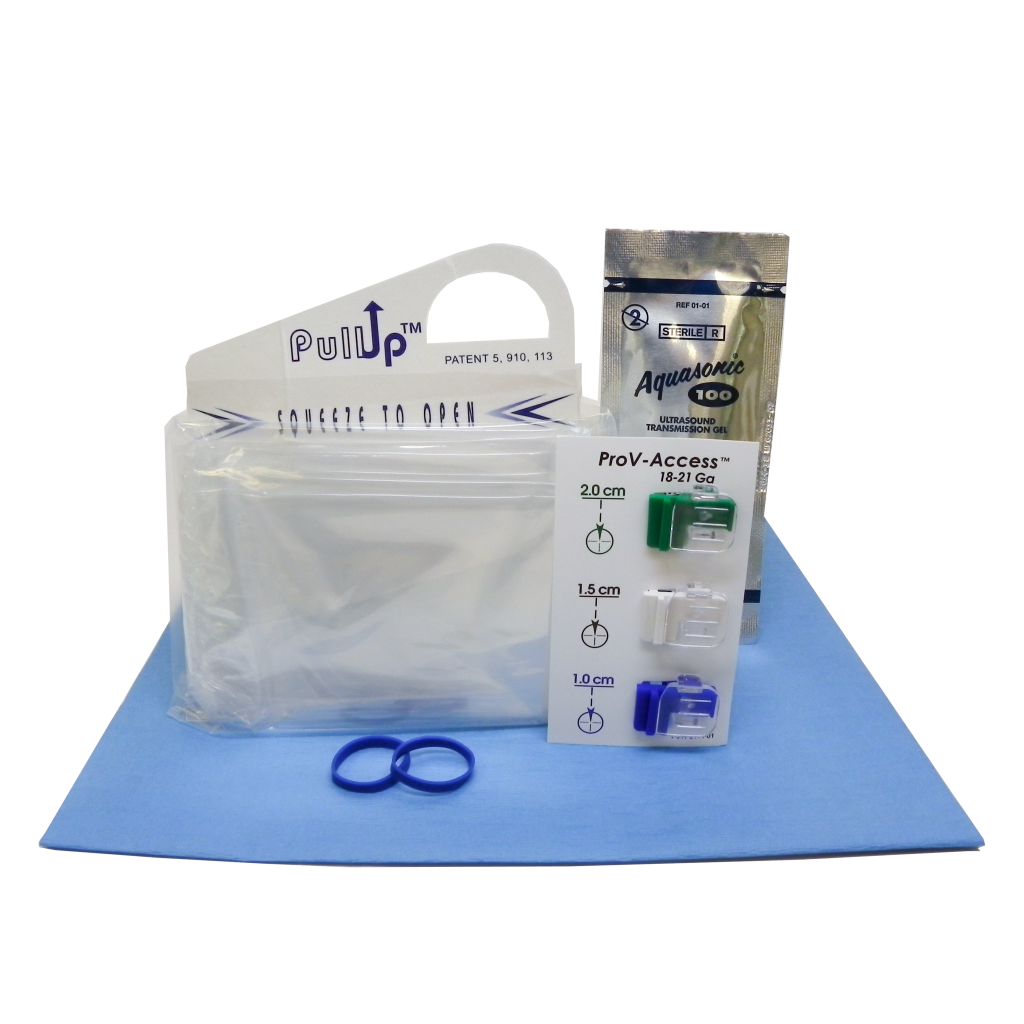 Kit sterili monouso per accesso vascolare, comprensivi di supporto guida (bracket), coprisonda ecografico latex free, gel sterile di alta qualità e sistemi di fissaggio latex free.
